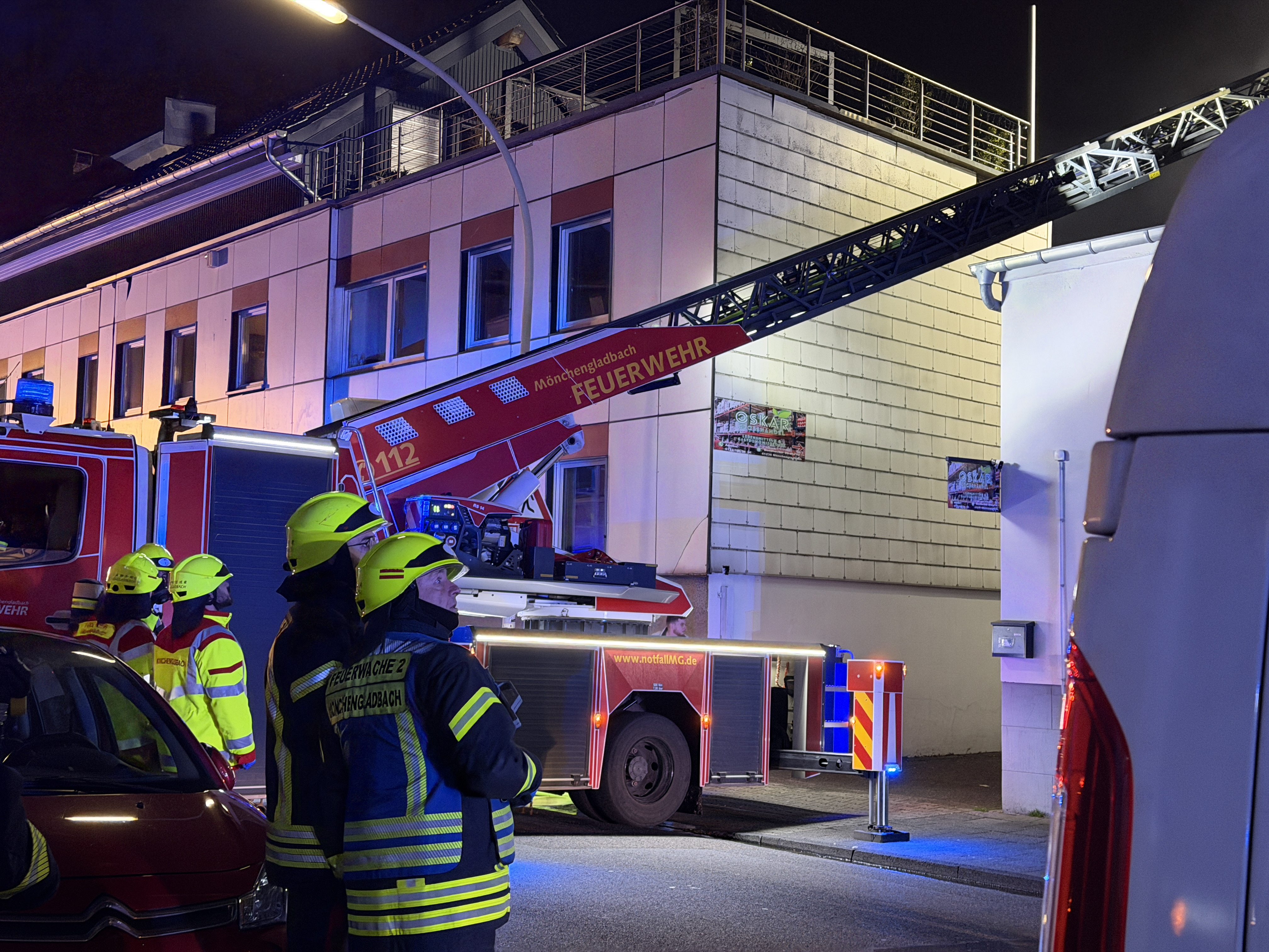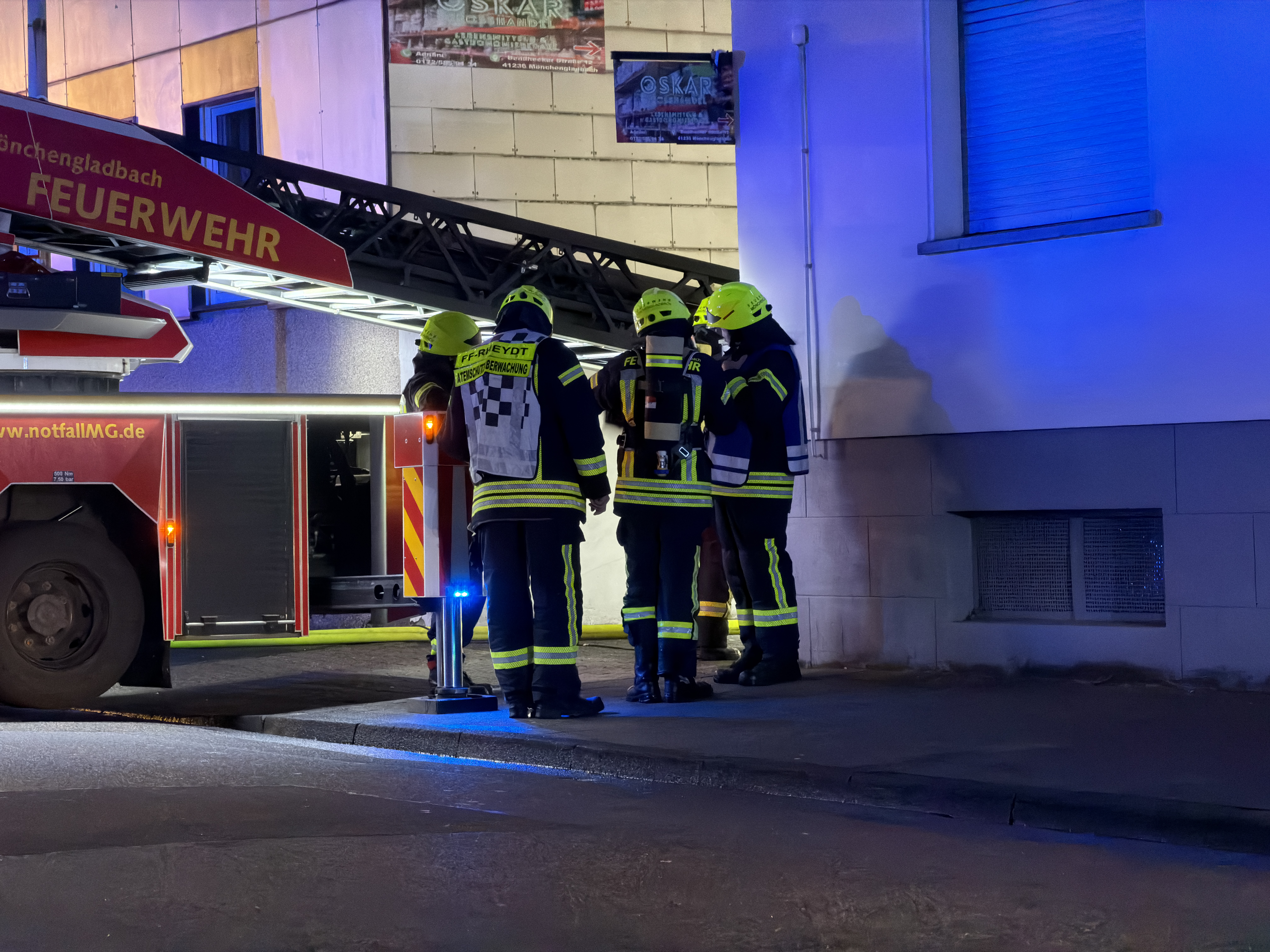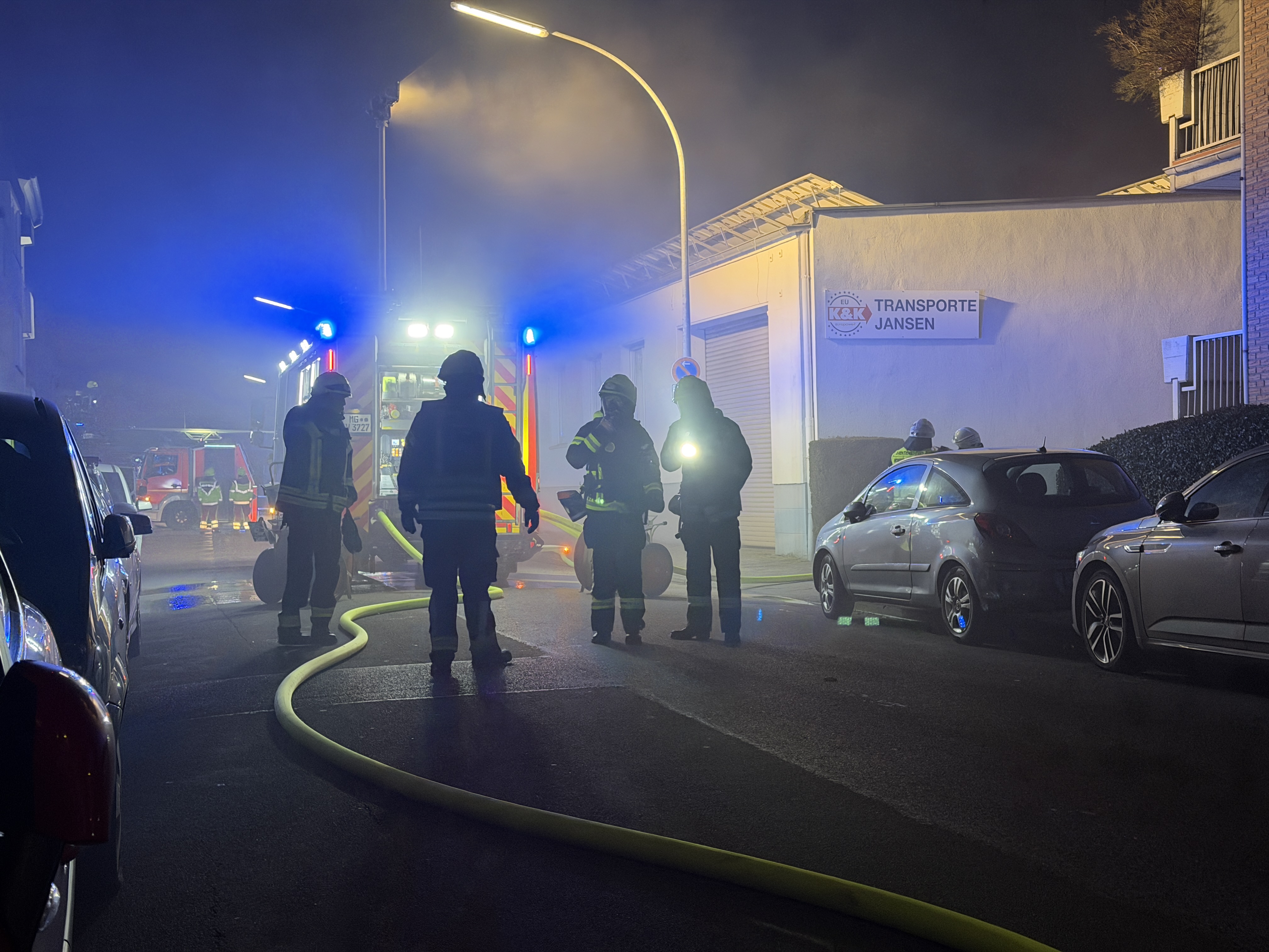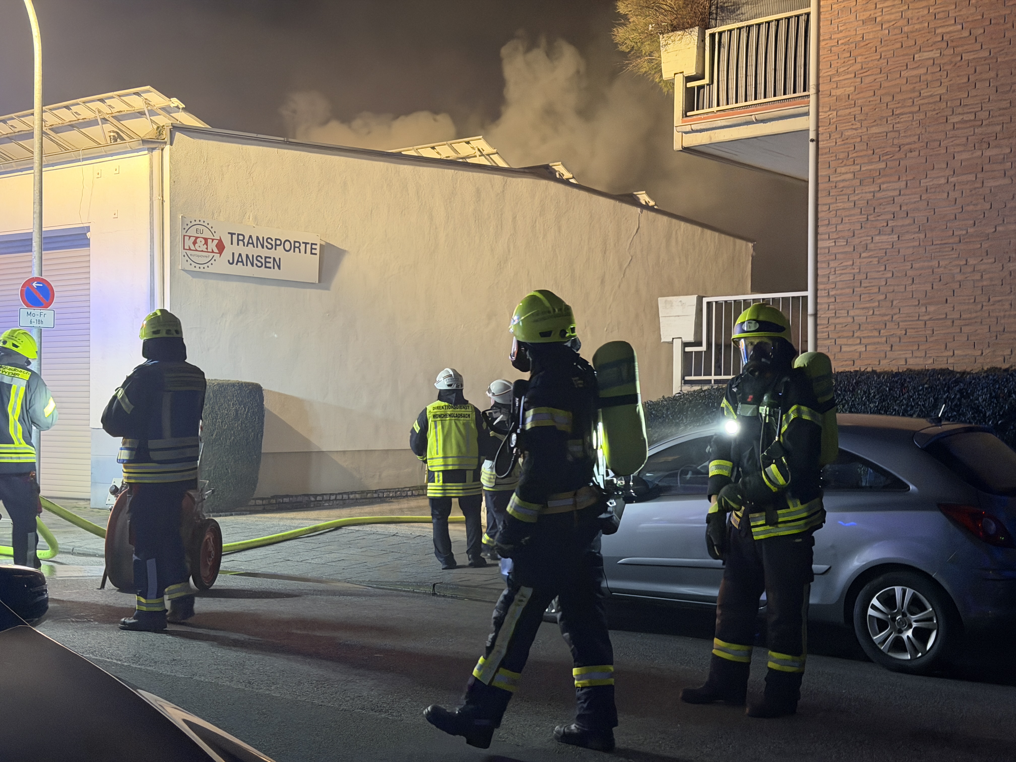 Ein kritischer Punkt des Einsatzes war das direkt angrenzende Bürogebäude. Um ein Übergreifen der Flammen auf den Verwaltungstrakt zu verhindern, errichtete die Feuerwehr eine sogenannte Riegelstellung – eine massive Wasserwand, die das Gebäude erfolgreich abschirmte.
