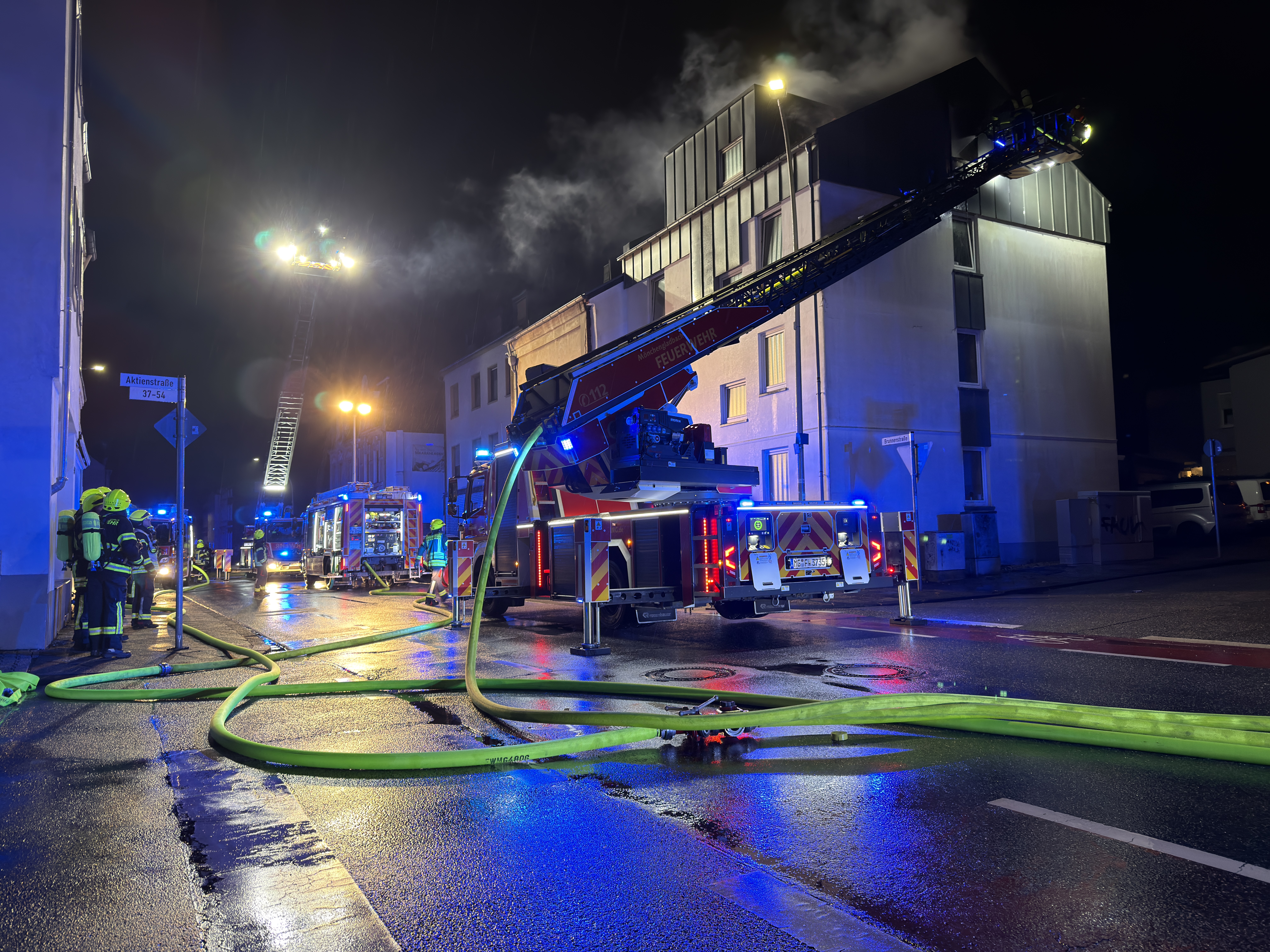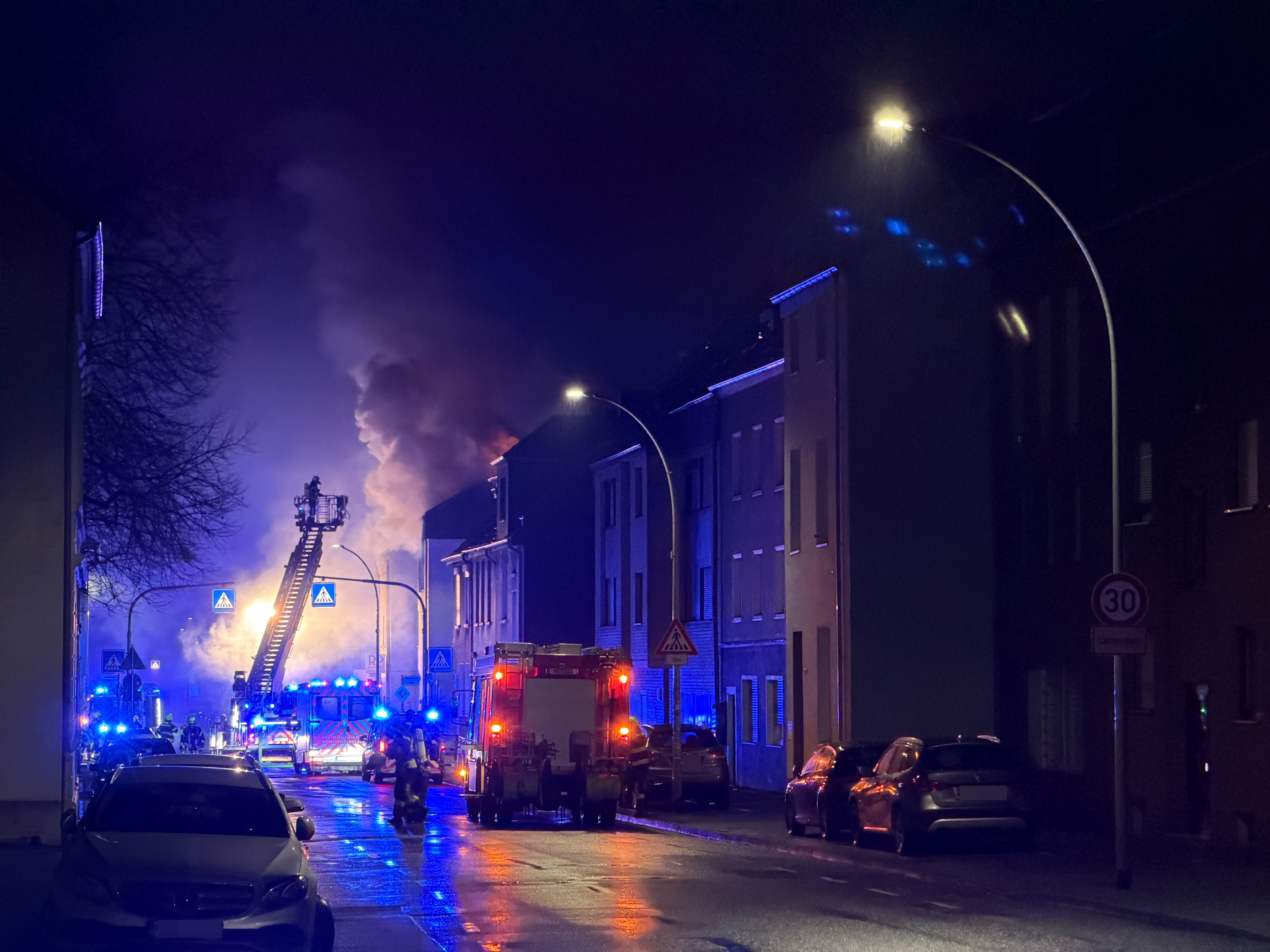 Am frühen Dienstagmorgen des 17. Februar 2026 wurde die Feuerwehr Mönchengladbach gegen 02.15 Uhr zu einem Brand in einem dreistöckigen Reiheneckhaus in der Brunnenstraße im Stadtteil Dahl gerufen. Beim Eintreffen der Einsatzkräfte standen Teile des Dachgeschosses bereits in Flammen. Alle Bewohner konnten das Gebäude selbstständig verlassen, bevor die Feuerwehrmaßnahmen begannen. Ein Bewohner wurde im Verlauf des Einsatzes mit dem Verdacht auf eine Rauchgasvergiftung in ein Krankenhaus gebracht. Das teilte die Feuerwehr offiziell mit.