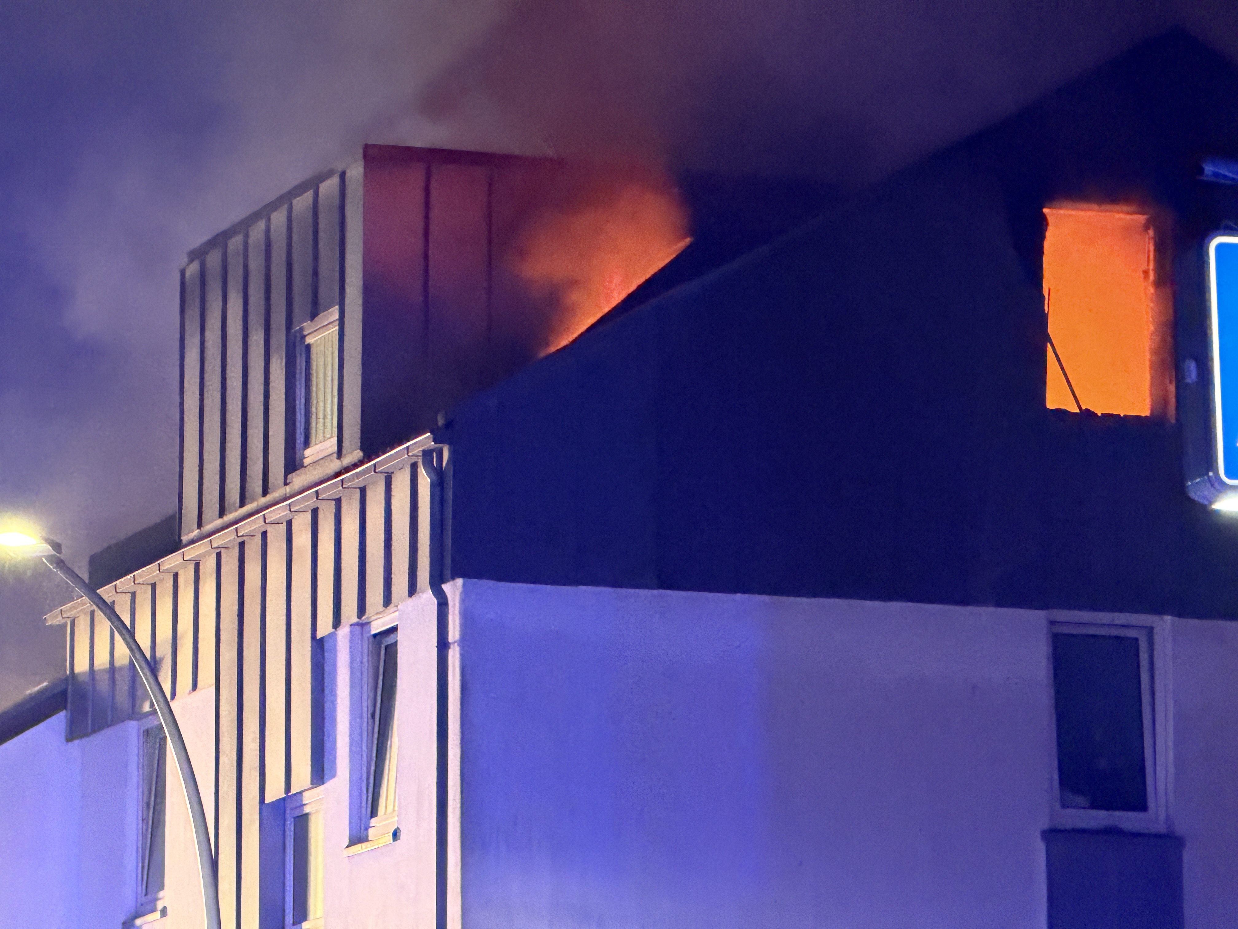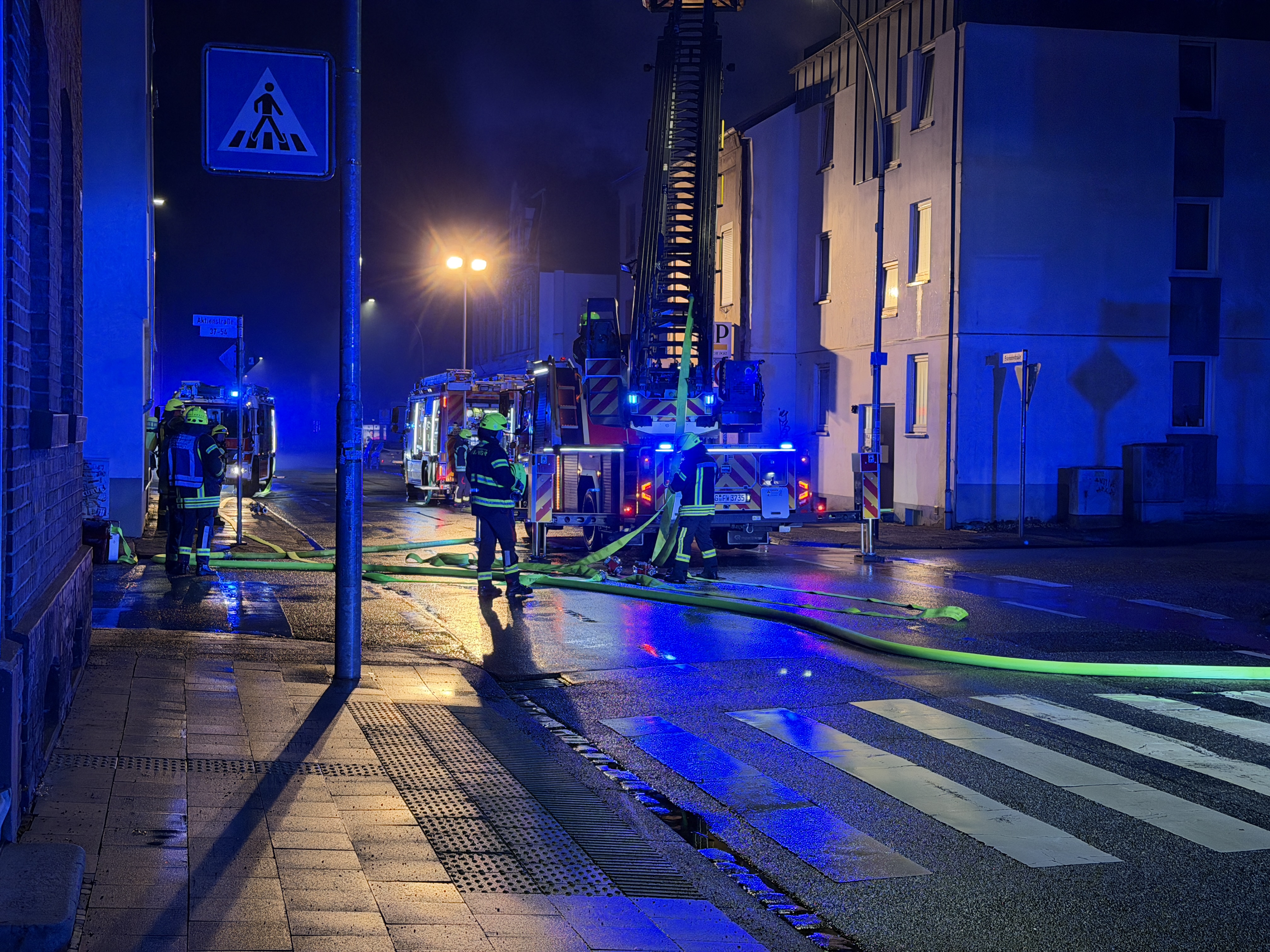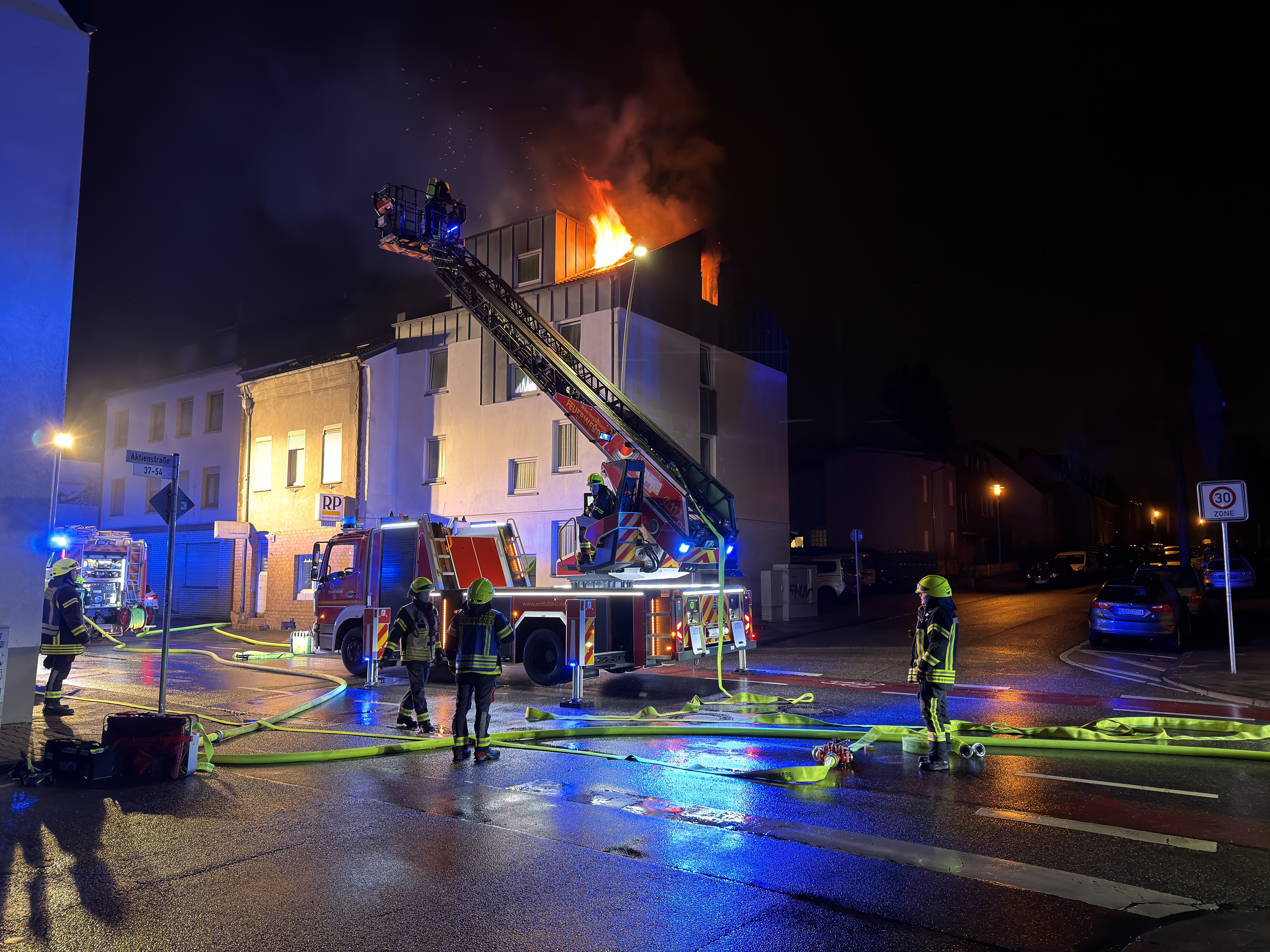 Die Brandbekämpfung erfolgte mit zwei Drehleitern, durch die es gelang, die Flammen rasch unter Kontrolle zu bringen und eine gefährliche Ausbreitung auf benachbarte Häuser zu verhindern. Mehrere Trupps gingen im Innenangriff vor, löschten Glutnester und entfernten beschädigte Teile des Dachstuhls. Das Gebäude wurde durch Brand- und Rauchentwicklung erheblich beschädigt und ist derzeit nicht bewohnbar.