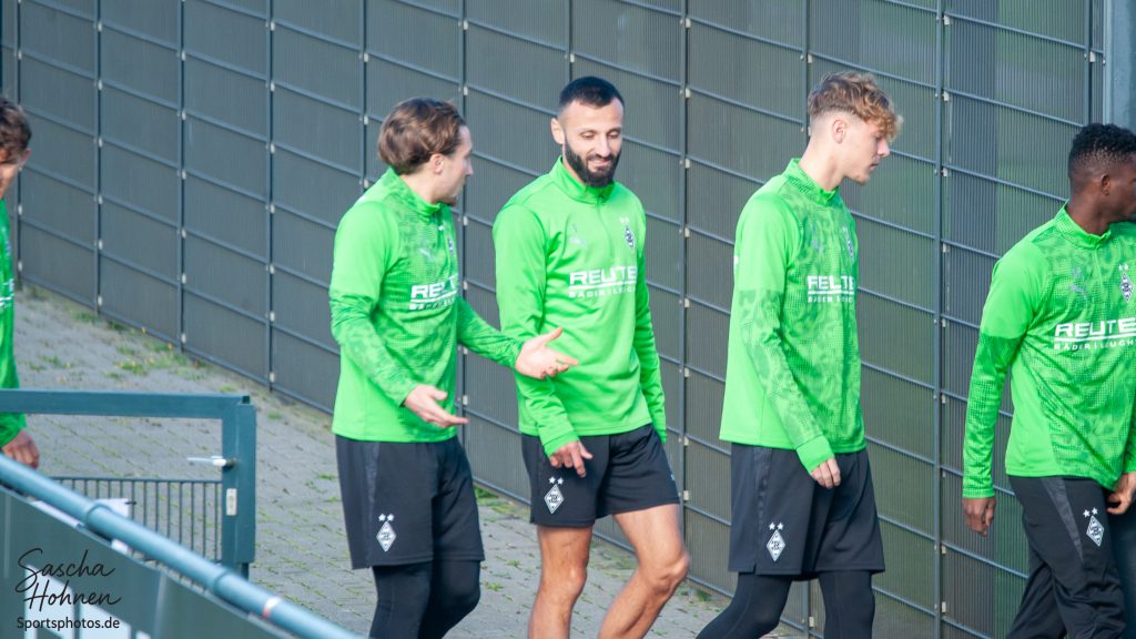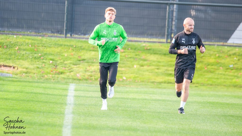 Robin Hack ist nach seiner Verletzung wieder ins leichte Lauftraining eingestiegen und dreht inzwischen auf dem Fohlenplatz seine Runden noch ohne Ball, aber mit zunehmender Intensität.