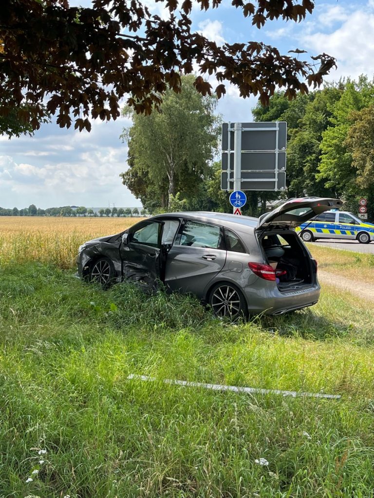Im Kreuzungsbereich prallten die beiden Wagen zusammen der Ford traf die Fahrerseite des Mercedes frontal. Durch die Wucht des Aufpralls drehten sich beide Fahrzeuge teils um die eigene Achse. Der Mercedes wurde dabei in ein angrenzendes Feld geschleudert. Beide Autos erlitten erhebliche Schäden und mussten abgeschleppt werden.